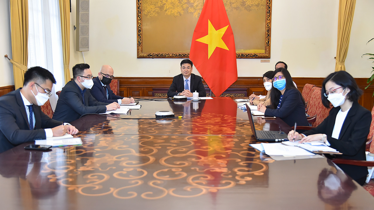 Thứ trưởng Bộ Ngoại giao Phạm Quang Hiệu tại cuộc tham vấn trực tuyến. Ảnh: hanoimoi.com.vn |