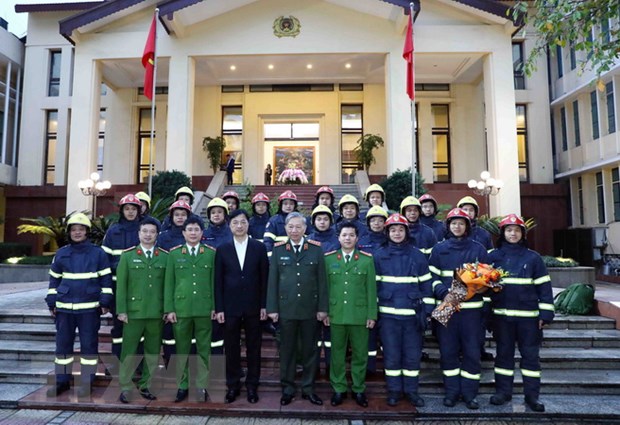 Đại tướng Tô Lâm, Bộ trưởng Bộ Công an với Đoàn công tác Bộ Công an đi cứu nạn, cứu hộ tại Thổ Nhĩ Kỳ. Ảnh: Phạm Kiên/TTXVN |