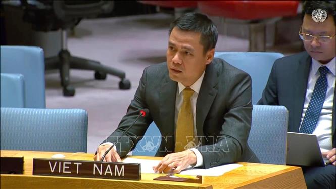 Đại sứ Đặng Hoàng Giang, Trưởng Phái đoàn Đại diện thường trực của Việt Nam tại LHQ, phát biểu tại phiên họp - Ảnh: TTXVN |