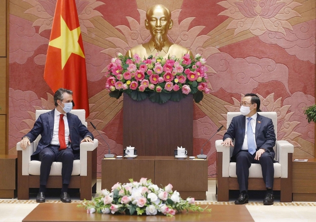 Chủ tịch Quốc hội cảm ơn EU đã hỗ trợ Việt Nam vaccine thời gian qua thông qua cơ chế COVAX, WHO. Tuy nhiên, tỷ lệ tiêm vaccine ở Việt Nam còn thấp, chưa thể tạo được miễn dịch cộng đồng để tạo thuận lợi cho phát triển kinh tế- xã hội, giao thương và du lịch. Qua Đại sứ, Chủ tịch Quốc hội đề nghị EU tiếp tục hỗ trợ, tạo điều kiện giúp Việt Nam tiếp cận nguồn vaccine phòng COVID-19 của châu Âu, hợp tác trong chia sẻ bản quyền công nghệ sản xuất vaccine phòng COVID-19. Chủ tịch Quốc hội Vương Đình Huệ cho rằng, trong điều kiện hiện nay, thế giới và không một khu vực, một quốc gia, hay một người dân nào sẽ được an toàn khi chưa đảm bảo được vaccine phòng COVID-19. Do vậy các quốc gia, doanh nghiệp sở hữu bản quyền công nghệ sản xuất vaccine cần tiếp tục chia sẻ với các quốc gia khác, nhất là các nước đang bị tác động nặng nền của đại dịch.