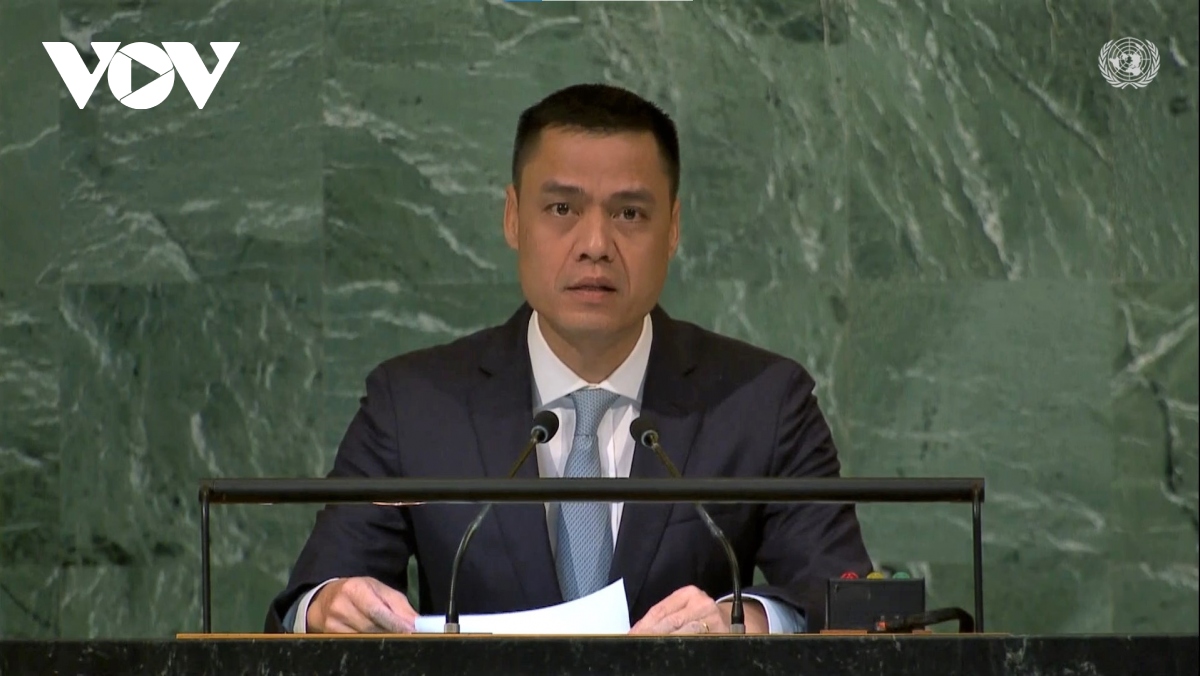 Đại sứ Đặng Hoàng Giang, Trưởng Phái đoàn thường trực Việt Nam tại Liên Hợp Quốc phát biểu. Ảnh: PV VOV tại Mỹ |