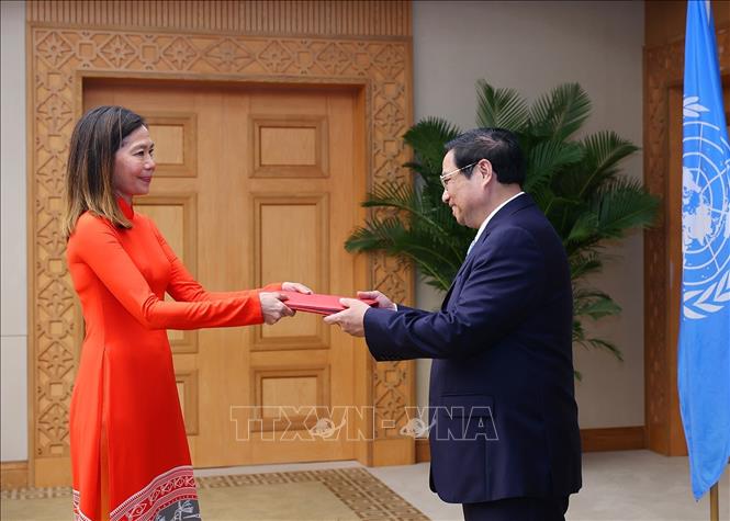 Bà Pauline Tamesis trình Thủ tướng Phạm Minh Chính thư ủy nhiệm của Tổng Thư ký Liên hợp quốc bổ nhiệm Điều phối viên thường trú của Liên hợp quốc tại Việt Nam. Ảnh: Dương Giang/TTXVN |