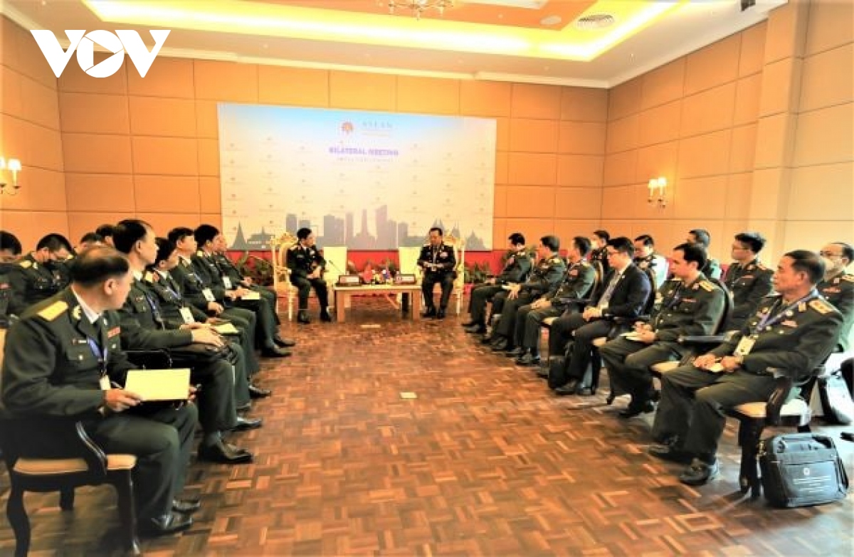 Bộ trưởng Phan Văn Giang và Đại tướng Chansamone Chanyalath, Phó Thủ tướng, Bộ trưởng Quốc phòng Lào. Ảnh: Văn Đỗ/VOV-Phnom Penh |