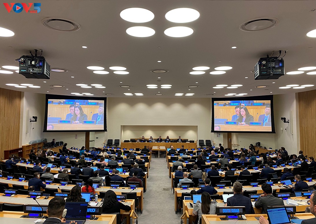 Tham tán công sứ Lê Thị Minh Thoa (giữa), Phó Trưởng Phái đoàn đại diện thường trực Việt Nam tại Liên hợp quốc, phát biểu tại Phiên họp. Ảnh: PV/VOV-Mỹ |