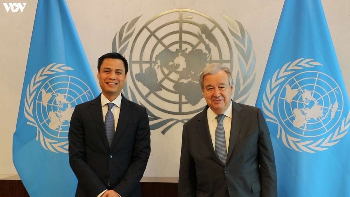 Trao đổi với TTK Antonio Guterres, Đại sứ Đặng Hoàng Giang cảm ơn sự hỗ trợ của LHQ đối với Việt Nam trong việc thực hiện các Mục tiêu phát triển bền vững và ứng phó biến đổi khí hậu, trong đó có cam kết giảm phát thải ròng bằng 0 vào năm 2050. Đại sứ chia sẻ mặc dù gặp nhiều thách thức, Việt Nam sẽ nỗ lực thực hiện đầy đủ các cam kết của mình thông qua các biện pháp nhanh chóng, toàn diện, vì lợi ích của chính người dân Việt Nam.
