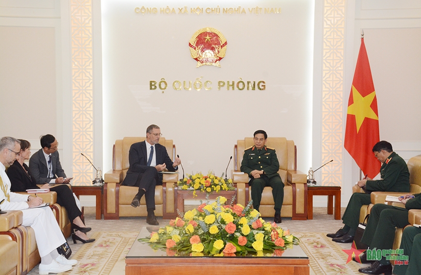 Đại tướng Phan Văn Giang tiếp Đại sứ Pháp Olivier Brochet. Ảnh: Hà Phương/qdnd.vn |