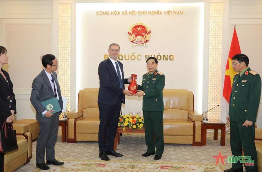 Đại tướng Phan Văn Giang trao quà lưu niệm tặng Đại sứ Pháp Olivier Brochet. Ảnh: Hà Phương/qdnd.vn |