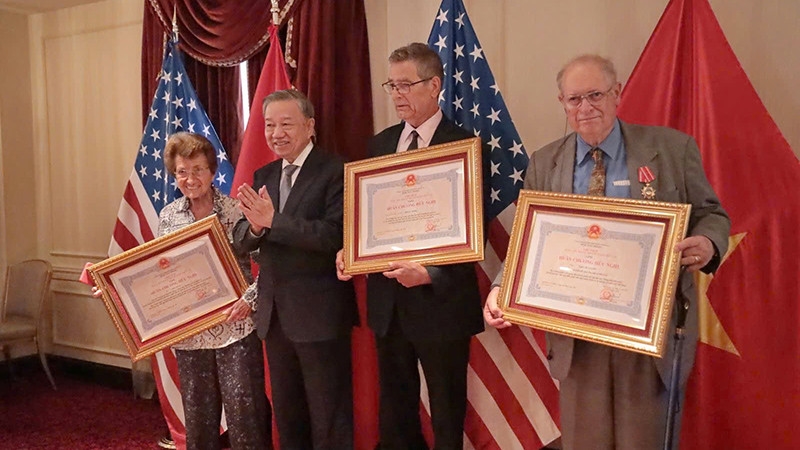 Tổng Bí thư, Chủ tịch nước Tô Lâm (nay là Tổng Bí thư) trao Huân chương Hữu nghị tặng những người bạn Mỹ của nhân dân Việt Nam, trong đó có bà Cora Weiss (ngoài cùng bên trái). Ảnh: Báo Nhân Dân |