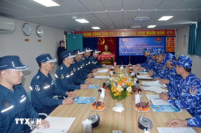 Lực lượng tuần tra của Cảnh sát biển Việt Nam - Trung Quốc hội đàm trên tàu CSB 8004. Ảnh: TTXVN |