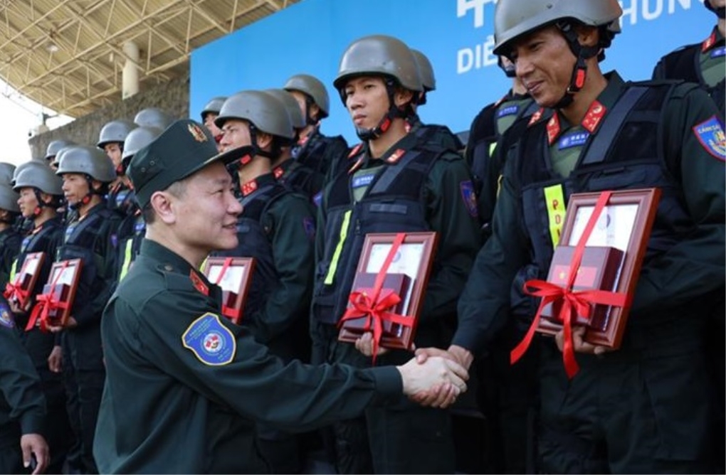 Thứ trưởng Bộ Công an Nguyễn Ngọc Lâm tặng quà lực lượng tham gia diễn tập. Ảnh: bocongan.gov.vn |