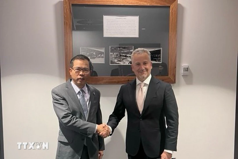 Đại sứ Việt Nam tại Australia Phạm Hùng Tâm (trái) và Thứ trưởng Bộ Quốc phòng Australia Hugh Jeffrey tại cuộc gặp. Ảnh: TTXVN phát |