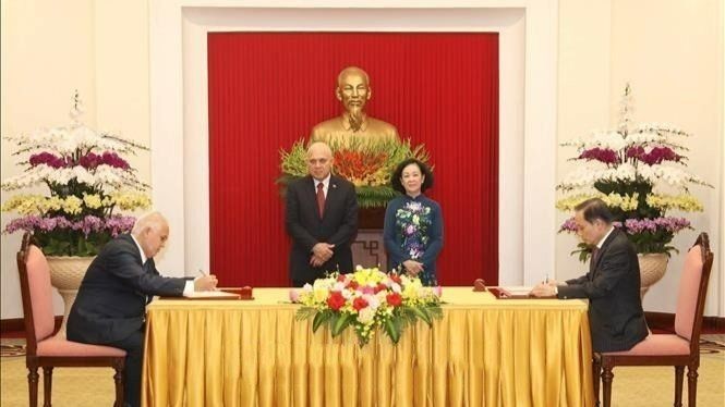 Sau hội đàm, hai Thường trực Ban Bí thư chứng kiến lễ ký thỏa thuận trao đổi và hợp tác giai đoạn 2023 - 2028 giữa Đảng Cộng sản Việt Nam và Đảng Cộng sản Cuba.
