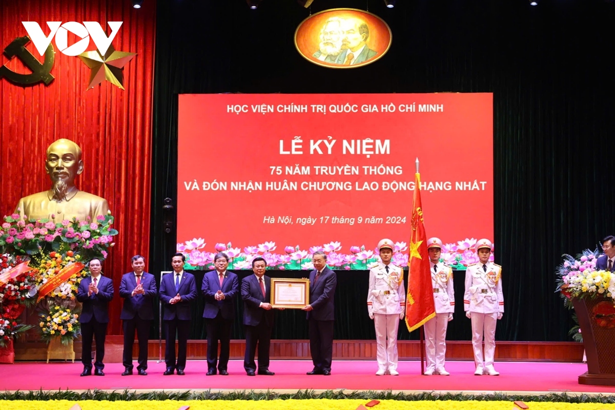 Tổng Bí thư, Chủ tich nước Tô Lâm phát biểu tại Lễ Kỷ niệm 75 năm Học viện Chính trị Quốc gia Hồ Chí Minh. Ảnh: VOV |
