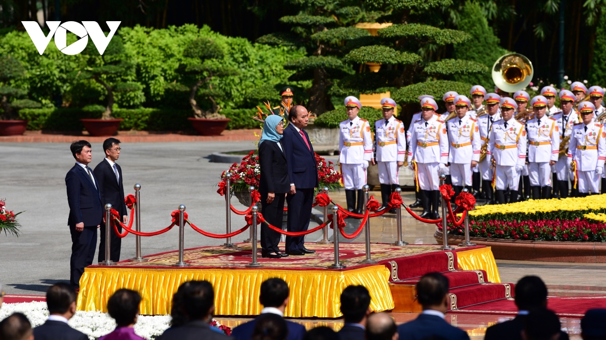 Chủ tịch nước Nguyễn Xuân Phúc đã chủ trì lễ đón chính thức Tổng thống Singapore Halimah Yacob. Ảnh: VOV |