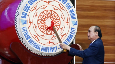 Chủ tịch nước Nguyễn Xuân Phúc đánh trống tại Lễ khai khóa 2022 Đại học Quốc gia Thành phố Hồ Chí Minh