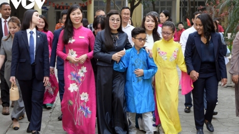 (VOV5) - Sáng 17/4, bà Lê Thị Bích Trân, Phu nhân Thủ tướng Phạm Minh Chính và bà Zinash Tayachew, Phu nhân Thủ tướng Ethiopia Abiy Ahmed Ali, đến thăm Trường PTCS Nguyễn Đình Chiểu (Hà Nội).