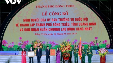 (VOV5) - Lễ công bố Nghị quyết của Ủy ban Thường vụ Quốc hội về thành lập thành phố Đông Triều (tỉnh Quảng Ninh) diễn ra tối 1/1.