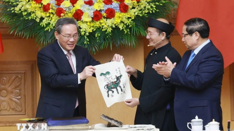Thủ tướng Phạm Minh Chính cùng Thủ tướng Trung Quốc Lý Cường trải nghiệm in tranh Đông Hồ