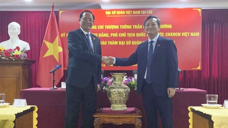 (VOV5) - Phó Chủ tịch Quốc hội Trần Quang Phương đề nghị các cán bộ Đại sứ quán Việt Nam tại Lào tiếp tục vun đắp, thúc đẩy mối quan hệ hữu nghị vĩ đại, tình đoàn kết đặc biệt Việt Nam – Lào.
