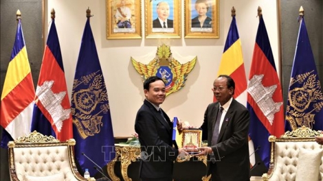 Phó Thủ tướng Trần Lưu Quang chào Phó Thủ tướng, Bộ trưởng Quốc phòng Campuchia Samdech Tea Banh