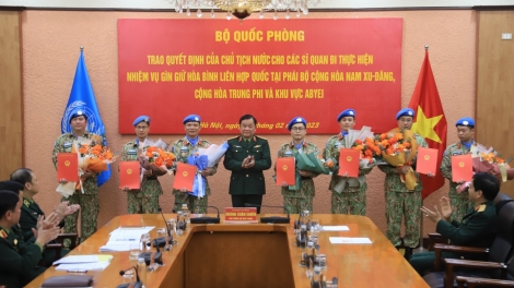 (VOV5) - Sáng nay (7/2), tại Hà Nội, Bộ Quốc phòng tổ chức buổi trao Quyết định của Chủ tịch nước cho 7 sĩ quan làm nhiệm vụ gìn giữ hòa bình Liên hợp quốc.