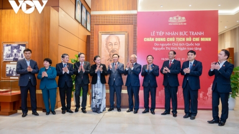 Chủ tịch Quốc hội Vương Đình Huệ tiếp nhận bức tranh vẽ Chủ tịch Hồ Chí Minh