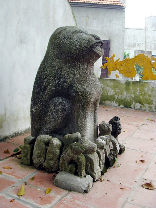 Trên một gò đất cao ở đầu làng, tiếp giáp với ngôi chùa cổ, còn có một bệ thờ rộng chừng mười mét vuông, xung quanh xây tường bao với hai cột trụ. Trên bệ thờ có một nhóm tượng chó. Chó tạc bằng đá xanh, ngồi chễm chệ trên bệ thờ. Ngồi giữa là tượng chó lớn, cao hơn 1 mét, quây quần xung quanh là đàn chó nhỏ, được tạo tác với nhiều dáng vẻ khác nhau, hết sức sinh động và ngộ nghĩnh. Cả đàn chó lớn, chó nhỏ đều hướng về phía Tây Bắc, phía cửa sông Hát, giữa hai đỉnh núi Ba Vì, Tam Đảo xa xa.