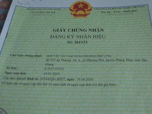 Cây cam xoàn giờ đã được người dân huyện Phụng Hiệp, tỉnh Hậu Giang coi là cây kinh tế. Cách đây 3 năm, các hộ trồng cam xoàn xã Phương Phú, huyện Phụng Hiệp, tỉnh Hậu Giang đã liên kết cùng làm ăn, thành lập Hợp tác xã cam xoàn Phương Phú. Năm ngoái, Hợp tác xã Phương Phú bán được hơn 400 tấn cam, trị giá gần 12 tỷ đồng. Các xã viên đều áp dụng quy trình sản xuất VietGAP (Quy trình do Bộ Nông nghiệp và Phát triển Nông thông ban hành có nghĩa là Thực hành sản xuất nông nghiệp tốt ở Việt Nam trên cơ sở 4 nhóm tiêu chí đảm bảo an toàn thực phẩm; bảo vệ môi trường; bảo đảm sức khỏe cho người lao động và phúc lợi xã hội; bảo đảm chất lượng sản phẩm). Cục Sở hữu Trí tuệ cũng đã cấp giấy chứng nhận bảo hộ nhãn hiệu tập thể “Cam xoàn Phụng Hiệp” cho Hợp tác xã Phương Phú. Nhãn hiệu được bảo hộ sử dụng cho nhóm quả cam tươi, nước cam ép, nước trái cây ép và nhóm dịch vụ là mua bán cây giống, mua bán hạt giống. Ông Võ Văn Đê, Giám đốc Hợp tác xã cam xoàn Phương Phú, cho biết: “Thương hiệu Hợp tác xã cam xoàn được công nhận vào tháng 6 năm 2016, lúc đó hợp tác xã đang làm chương trình VietGAP và chương trình VietGAP cũng mới được công nhận. Hiện nay cam ở đây, xã viên của Hợp tác xã trồng bao nhiêu bán cũng hết, thương lái đến tận vườn mua hết luôn.”
