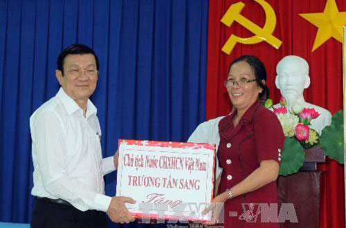 | Chủ tịch nước Trương Tấn Sang tặng quà cho xã nông thôn mới Tân Lân, huyện Cần Đước. Ảnh: Thanh Vũ – TTXVN |