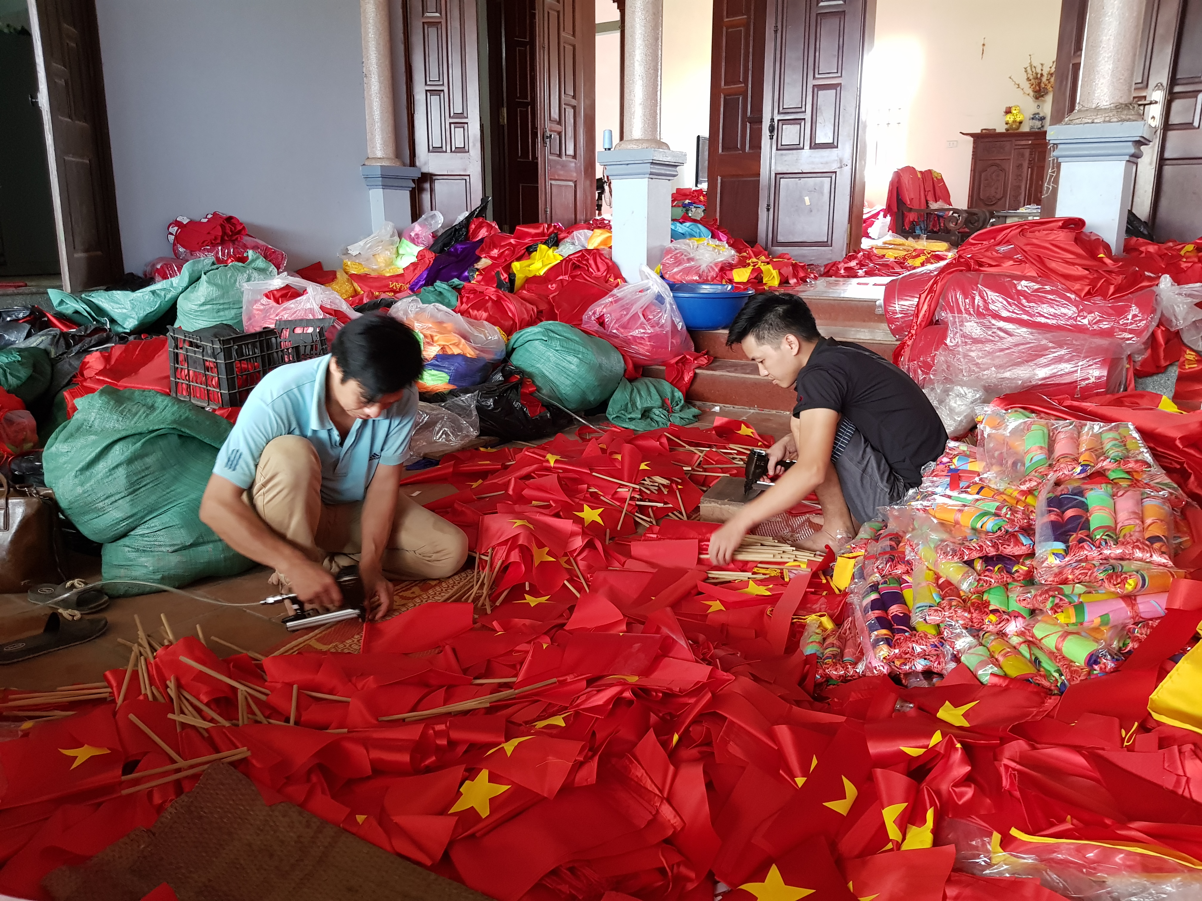 Em Nguyễn Thị Thảo, một thợ làm cờ trong làng, chia sẻ: “Để làm ra cờ bước đầu phải chọn vải đẹp, cắt thành cờ rồi may. Có mấy lần may, may viền, may mặt, phải đo chính xác, lấy phấn đánh dấu rồi đặt ngôi sao và lấy ghim để giữ. Bước quan trọng là ghép ngôi sao vào cờ, phải chính xác, ở giữa. Một ngày em làm 200 đến 300 cờ.”