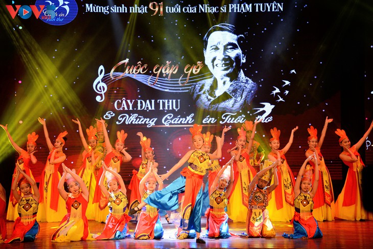 Tối 12/1, Đài Tiếng nói Việt Nam tổ chức Chương trình gặp gỡ “Cây đại thụ và cánh én tuổi thơ” nhân kỷ niệm sinh nhật 91 tuổi của Nhạc sĩ Phạm Tuyên. Cả cuộc đời dành trọn tình yêu cho âm nhạc, nhạc sĩ Phạm Tuyên đã sáng tác gần 700 tác phẩm, trong đó có hơn 200 bài hát dành cho thiếu nhi. Ông được ví như người kể lịch sử bằng âm nhạc, nhạc sĩ của nhân dân. Và đêm nhạc chính là cuộc giao lưu giữa nhạc sĩ với các em thiếu nhi, nhạc sĩ, ca sĩ, nhà thơ, nhà báo và khán giả thân thiết. Khán giả tới dự chương trình ở đủ mọi lứa tuổi, từ những em bé chạy đùa khắp sảnh cho đến các cụ già tóc bạc phơ, phải để con cháu dìu. Điểm chung nhất giữa họ chính là tình yêu mến đặc biệt dành cho các ca khúc không tuổi của nhạc sỹ Phạm Tuyên.