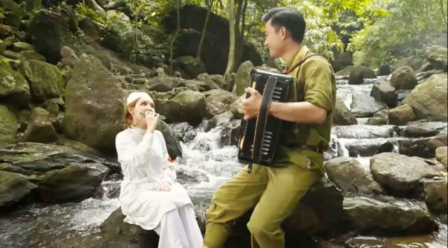 Lê Na - người dịch ca khúc Đất nước sang tiếng Nga, cũng đảm nhận vai nữ y tá, cùng diễn viên Tiến Lộc trong phim |