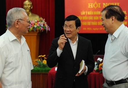 (VOV5) - Chiều nay (27/3), tại Hà Nội, Mặt trận Tổ quốc Việt Nam tổ chức Hội nghị lấy ý kiến nhân sĩ, trí thức, luật gia, người tiêu biểu các dân tộc thiểu số, chức sắc tôn giáo góp ý vào dự thảo sửa đổi Hiến Pháp 1992. Chủ tịch nước Trương Tấn Sang tới dự.