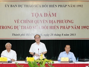 (VOV5) - Sáng 28/8, tại thành phố Hồ Chí Minh, Ủy ban Dự thảo sửa đổi Hiến pháp 1992 tổ chức tọa đàm khoa học về chính quyền địa phương trong Dự thảo sửa đổi Hiến pháp 1992. Chủ tịch Quốc hội Nguyễn Sinh Hùng, Chủ tịch Ủy ban Dự thảo sửa đổi Hiến pháp 1992, dự và chủ trì tọa đàm.