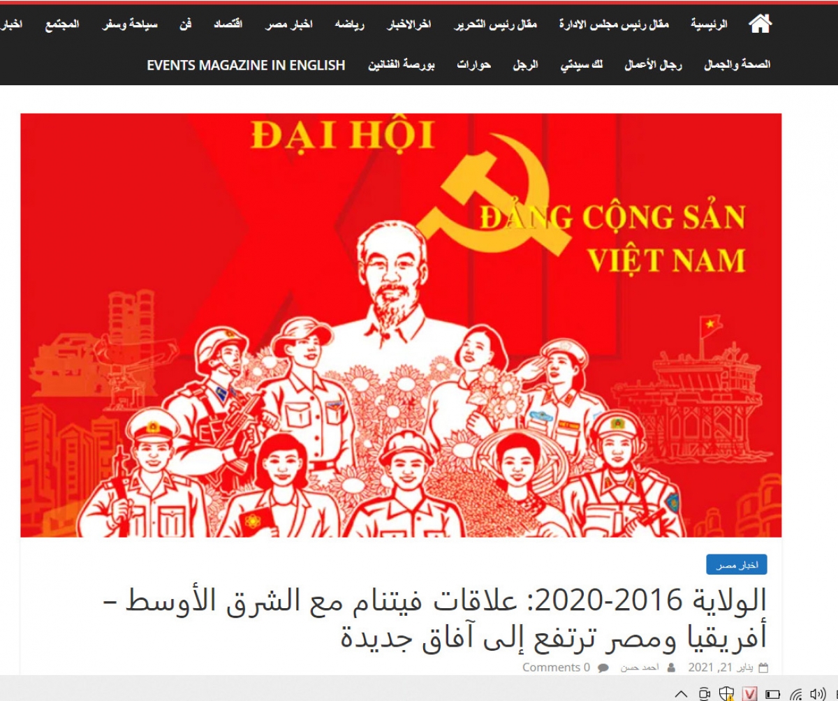 Tờ báo điện tử “Tin tức Dân tộc” (elWatan News - tờ báo điện tử lớn thứ 2 ở Ai Cập) ngày 23/1 đăng bài viết với tiêu đề “Thành công của Đại hội toàn quốc Đảng Cộng sản Việt Nam sẽ xác định phương hướng củng cố quan hệ Việt Nam - Ai Cập”.