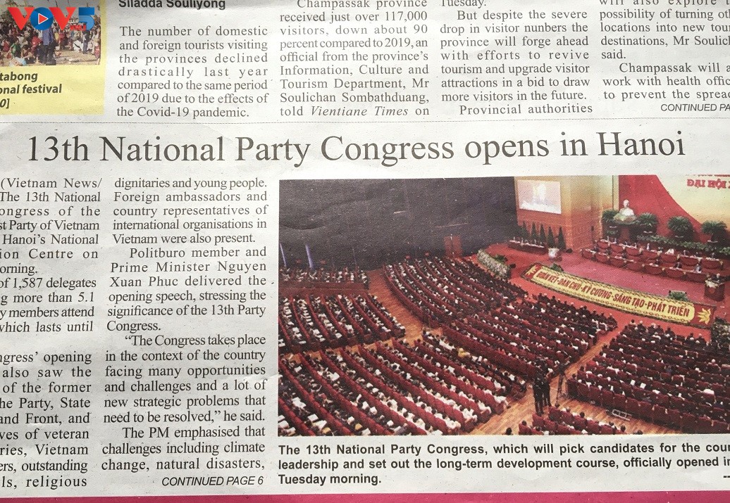 Báo Vientiane Times trong 2 ngày 26 và 27/1, cũng đăng trang nhất tin bài về hoạt động của các Đoàn đại biểu dự Đại hội lần thứ XIII của Đảng Cộng sản Việt Nam, đăng thư của Ban chấp hành Trung ương Đảng Nhân dân Cách mạng Lào gửi Ban chấp hành trung ương Đảng Cộng sản Việt Nam, ca ngợi những thắng lợi vang dội, toàn diện và có ý nghĩa lịch sử của nhân dân Việt Nam anh em qua các cuộc kháng chiến giải phóng đất nước cũng như xây dựng và bảo vệ Tổ quốc hiện nay.