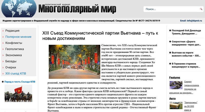 Bài báo được đăng trên Tạp chí chính trị “Thế giới đa cực” của Nga. (Ảnh chụp màn hình) |