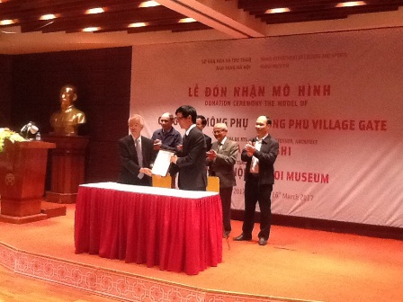 (VOV5) - Bảo tàng Hà Nội chiều 16/3 tổ chức lễ đón nhận mô hình cổng làng Mông Phụ của làng cổ Đường Lâm, do Giáo sư, Kiến trúc sư Ejima Akiyoshi người Nhật Bản trao tặng.