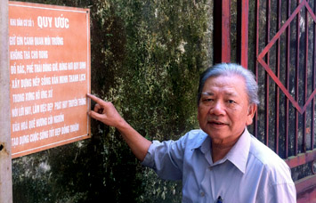 | Trưởng ban Công tác Mặt trận Nguyễn Ngọc Diệp bên bản quy ước xây dựng khu dân cư văn hóa. Ảnh: báo Đại đoàn kết |