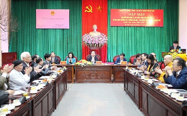 Nhân dịp chuẩn bị đón Tết Nguyên Đán Mậu Tuất 2018 trưa ngày 23/1, thành phố Hà Nội tổ chức gặp mặt các đại biểu văn nghệ sĩ, trí thức, chức sắc tôn giáo, bí thư, hiệu trưởng các trường đại học cao đẳng trên địa bàn Thành phố.
