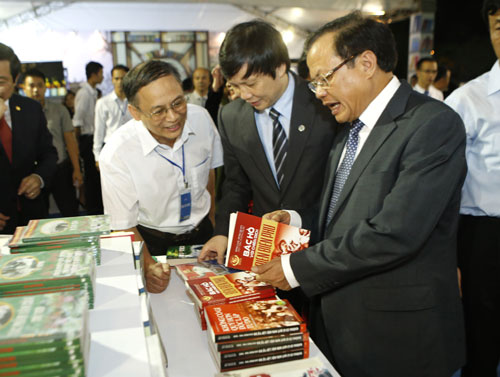 | Bí thư Thành ủy Phạm Quang Nghị thăm một gian hàng tại Hội sách “Hà Nội - Thành phố vì hòa bình”. Ảnh: Ngọc Châu |