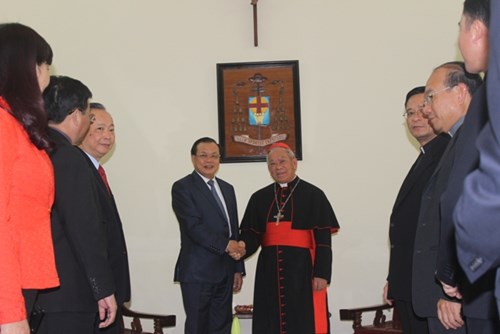 | Ông Phạm Quang Nghị thăm và chúc mừng Tổng Giám mục, Tổng Giáo phận Hà Nội. Ảnh: anninhthudo.vn |