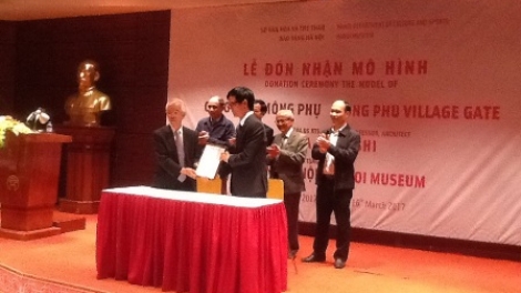 (VOV5) - Bảo tàng Hà Nội chiều 16/3 tổ chức lễ đón nhận mô hình cổng làng Mông Phụ của làng cổ Đường Lâm, do Giáo sư, Kiến trúc sư Ejima Akiyoshi người Nhật Bản trao tặng.