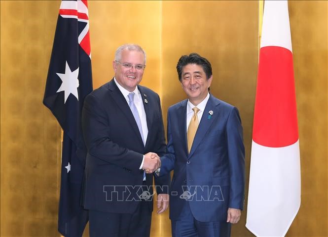 Thủ tướng Nhật Bản Shinzo Abe (phải) và người đồng cấp Australia Scott Morrison trong cuộc gặp tại Osaka (Nhật Bản) ngày 27/6/2019. - Ảnh: AFP/TTXVN |