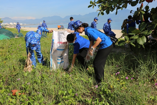Đoàn viên, thanh niên quận Thanh Khê và cán bộ, chiến sĩ BTL Vùng Cảnh sát biển 2 tham gia chương trình "Chung tay làm sạch biển". Ảnh: nld.com.vn