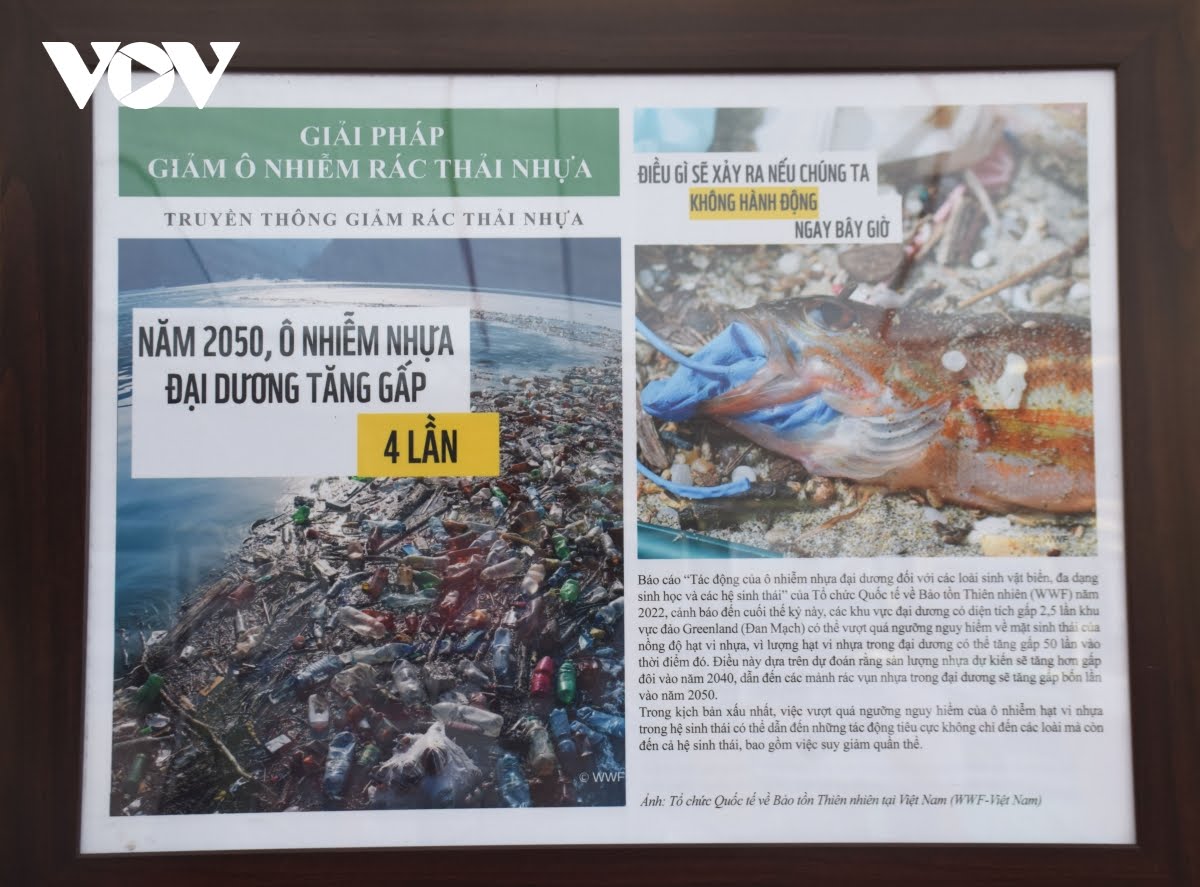 Một tác phẩm ảnh rác thải nhựa được trưng bày. Ảnh: VOV