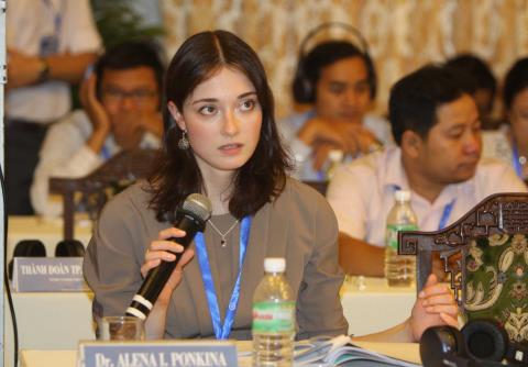 Tiến sĩ Alena, Giảng viên Đại học Luật Kutafin – Moscow, Liên Bang Nga với bài tham luận “Các vấn đề trong việc xác định quy chế pháp lý của đảo nhân tạo”. Ảnh: Thanh Vũ – TTXVN