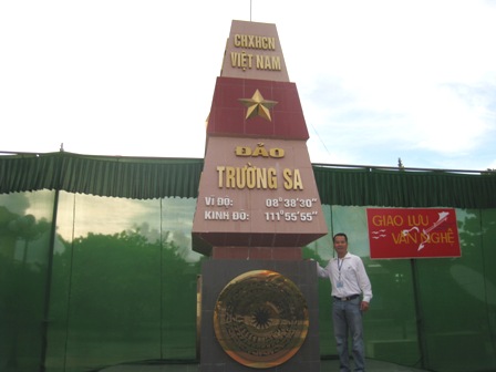 | Anh Michael Bùi tại cột mốc chủ quyền đảo Trường Sa |