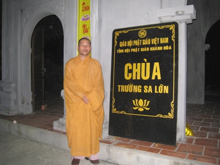 | Thượng tọa Thích Giác Nghĩa đứng trước cổng chùa Trường Sa Lớn |