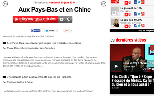 Tuần qua, lần đầu tiên Đài phát thanh FranceInfos của Pháp đã phát đi chuỗi phóng sự của phóng viên Philippe Reltien, người trực tiếp có mặt tại khu vực Trung Quốc hạ đặt trái phép giàn khoan Hải Dương-981 trong vùng đặc quyền kinh tế của Việt Nam cho thấy những bằng chứng hùng hồn về hành động hiếu chiến của các tàu Trung Quốc trong việc tấn công, rượt đuổi các tàu chấp pháp của Việt Nam.